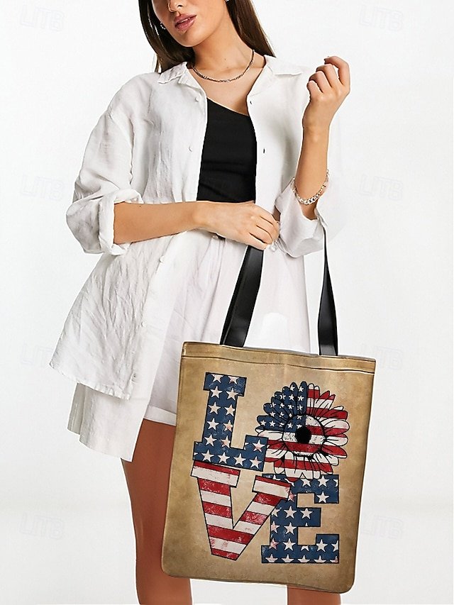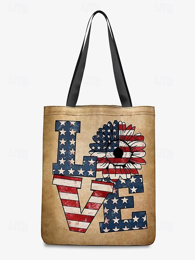 Gender: Women’s, Type: Canvas Tote Bag, Material: Polyester, Embellishment: Print, Pattern: American Flag, Sunflower, Detachable strap: Non-Detachable, Adjustable strap: Non-Adjustable, Occasion: Casual Daily, Shopping, Width (cm): 1, Height (cm): 45, Length (cm): 36, Function: Lightweight, Foldable, Large Capacity, Category: Tote,